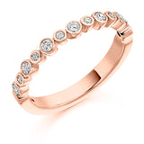 This Ladies 18ct Rose Gold Half Set Round Brilliant 0.30ct Diamond 3mm Eternity Ring is in a rubover set. A rubover setting describes how each diamond is held. When the diamond is added to the ring it is dropped down into a perfect seat before a small portion of metal is carefully rubbed over the outer edge. This holds it safely in place and creates a clean smooth finish.