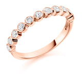 This Ladies 18ct Rose Gold Half Set Round Brilliant 0.50ct Diamond 2.5mm Wedding Ring is in a rubover set. A rubover setting describes how each diamond is held. When the diamond is added to the ring it is dropped down into a perfect seat before a small portion of metal is carefully rubbed over the outer edge. This holds it safely in place and creates a clean smooth finish.