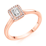 18ct Rose Gold Diamond Engagement Ring With Emerald Cut Centre Solitaire and Round Brilliant Cut Diamond Halo
