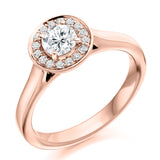 18ct Rose Gold Diamond Engagement Ring With GIA Certified Round Brilliant Cut Solitaire Centre, Diamond Halo and Plain Shoulders