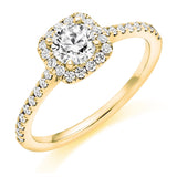 18ct Yellow Gold Diamond Engagement Ring With a GIA Certified Round Brilliant Cut Centre Solitaire, Cushion Shaped Halo and Round Brilliant Cut Diamond Set Shoulders
