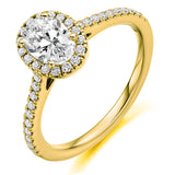 18ct Yellow Gold GIA Certified Diamond Engagement Ring With Oval Cut Centre Solitaire, Diamond Halo and Diamond Set Shoulders