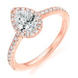 9ct Rose Gold Diamond Engagement Ring With a GIA Certified Pear Shaped Centre Solitaire, Round Brilliant Cut Diamond Halo and Diamond Set Shoulders