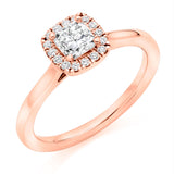 9ct Rose Gold Diamond Engagement Ring With GIA Certified Cushion Cut Centre Solitaire and Round Brilliant Cut Diamond Halo