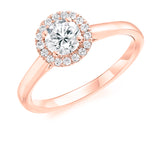 9ct Rose Gold GIA Certified Diamond Engagement Ring With Round Brilliant Cut Centre Solitaire and Diamond Halo