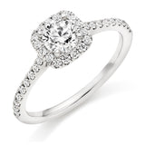 9ct White Gold Diamond Engagement Ring With a GIA Certified Round Brilliant Cut Centre Solitaire, Cushion Shaped Halo and Round Brilliant Cut Diamond Set Shoulders