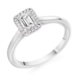 9ct White Gold Diamond Engagement Ring With Emerald Cut Centre Solitaire and Round Brilliant Cut Diamond Halo