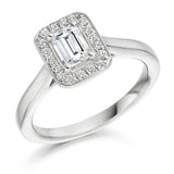 9ct White Gold Diamond Engagement Ring With GIA Certified Emerald Cut Centre Stone and Round Brilliant Cut Diamond Halo