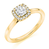 9ct Yellow Gold Diamond Engagement Ring With GIA Certified Cushion Cut Centre Solitaire and Round Brilliant Cut Diamond Halo