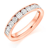 This Ladies 18ct Rose Gold Half Set Mixed 1.00ct Diamond 4mm Eternity Ring is in a channel set. A channel set Eternity ring has a neat edged style which allows each diamond to sit perfectly side by side. This style is traditional and should be worn next to a engagement ring with either plain shoulders or diamond channel set shoulders of the same style.
