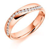 This Ladies 18ct Rose Gold Half Set Round Brilliant 0.30ct Diamond 4mm Eternity Ring is in a channel set. A channel set Eternity ring has a neat edged style which allows each diamond to sit perfectly side by side. This style is traditional and should be worn next to a engagement ring with either plain shoulders or diamond channel set shoulders of the same style.