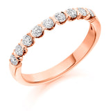 This Ladies 18ct Rose Gold Half Set Round Brilliant 0.50ct Diamond 2.5mm Eternity Ring is in a rubover set. A rubover setting describes how each diamond is held. When the diamond is added to the ring it is dropped down into a perfect seat before a small portion of metal is carefully rubbed over the outer edge. This holds it safely in place and creates a clean smooth finish.