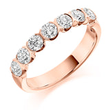 This Ladies 18ct Rose Gold Half Set Round Brilliant 1.00ct Diamond 3.5mm Eternity Ring is in a rubover set. A rubover setting describes how each diamond is held. When the diamond is added to the ring it is dropped down into a perfect seat before a small portion of metal is carefully rubbed over the outer edge. This holds it safely in place and creates a clean smooth finish.