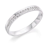 This Ladies 18ct White Gold Half Set Round Brilliant 0.15ct Diamond 2.5mm Eternity Ring is in a grain set. A grain set Eternity ring has a small margin of metal either side of the diamond which protects the ring over time. Each diamond is then held in place by a small number of metal beads or grains. This offers an extra sparkle as light not only bounces off each diamond but, also off the grains.