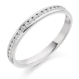 This Ladies 18ct White Gold Half Set Round Brilliant 0.25ct Diamond 2.5mm Eternity Ring is in a channel set. A channel set Eternity ring has a neat edged style which allows each diamond to sit perfectly side by side. This style is traditional and should be worn next to a engagement ring with either plain shoulders or diamond channel set shoulders of the same style.