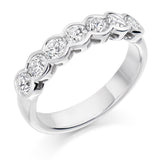 This Ladies 18ct White Gold Half Set Round Brilliant 1.00ct Diamond 4mm Eternity Ring is in a rubover set. A rubover setting describes how each diamond is held. When the diamond is added to the ring it is dropped down into a perfect seat before a small portion of metal is carefully rubbed over the outer edge. This holds it safely in place and creates a clean smooth finish.