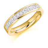 This Ladies 18ct Yellow Gold Half Set Mixed 1.00ct Diamond 4mm Eternity Ring is in a channel set. A channel set Eternity ring has a neat edged style which allows each diamond to sit perfectly side by side. This style is traditional and should be worn next to a engagement ring with either plain shoulders or diamond channel set shoulders of the same style.