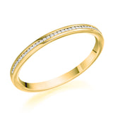This Ladies 18ct Yellow Gold Half Set Round Brilliant 0.07ct Diamond 2mm Eternity Ring is in a channel set. A channel set Eternity ring has a neat edged style which allows each diamond to sit perfectly side by side. This style is traditional and should be worn next to a engagement ring with either plain shoulders or diamond channel set shoulders of the same style.