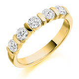 This Ladies 18ct Yellow Gold Half Set Round Brilliant 0.75ct Diamond 3.5mm Eternity Ring is in a rubover set. A rubover setting describes how each diamond is held. When the diamond is added to the ring it is dropped down into a perfect seat before a small portion of metal is carefully rubbed over the outer edge. This holds it safely in place and creates a clean smooth finish.