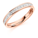 This Ladies 9ct Rose Gold Half Set Princess 0.75ct Diamond 3mm Eternity Ring is in a channel set. A channel set Eternity ring has a neat edged style which allows each diamond to sit perfectly side by side. This style is traditional and should be worn next to a engagement ring with either plain shoulders or diamond channel set shoulders of the same style.