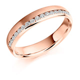 This Ladies 9ct Rose Gold Half Set Round Brilliant 0.26ct Diamond 4mm Eternity Ring is in a channel set. A channel set Eternity ring has a neat edged style which allows each diamond to sit perfectly side by side. This style is traditional and should be worn next to a engagement ring with either plain shoulders or diamond channel set shoulders of the same style.