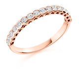 This Ladies 9ct Rose Gold Half Set Round Brilliant 0.50ct Diamond 2.5mm Eternity Ring is in a rubover set. A rubover setting describes how each diamond is held. When the diamond is added to the ring it is dropped down into a perfect seat before a small portion of metal is carefully rubbed over the outer edge. This holds it safely in place and creates a clean smooth finish.