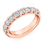 This Ladies 9ct Rose Gold Half Set Round Brilliant 1.50ct Diamond 4.5mm Eternity Ring is in a claw set. A claw set Eternity ring complements almost any engagement ring as the claws which hold each diamond resemble the claws which hold the diamond in an engagement ring. This means that a claw set Eternity ring is a great addition in most cases.
