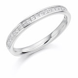 This Ladies 9ct White Gold Half Set Princess 0.33ct Diamond 2.5mm Eternity Ring is in a channel set. A channel set Eternity ring has a neat edged style which allows each diamond to sit perfectly side by side. This style is traditional and should be worn next to a engagement ring with either plain shoulders or diamond channel set shoulders of the same style.
