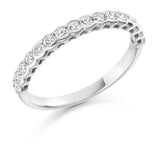 This Ladies 9ct White Gold Half Set Round Brilliant 0.50ct Diamond 2.5mm Eternity Ring is in a rubover set. A rubover setting describes how each diamond is held. When the diamond is added to the ring it is dropped down into a perfect seat before a small portion of metal is carefully rubbed over the outer edge. This holds it safely in place and creates a clean smooth finish.