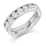 This Ladies 9ct White Gold Half Set Round Brilliant 2.00ct Diamond 5mm Eternity Ring is in a channel set. A channel set Eternity ring has a neat edged style which allows each diamond to sit perfectly side by side. This style is traditional and should be worn next to a engagement ring with either plain shoulders or diamond channel set shoulders of the same style.