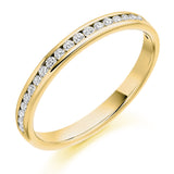 This Ladies 9ct Yellow Gold Half Set Round Brilliant 0.25ct Diamond 2.5mm Eternity Ring is in a channel set. A channel set Eternity ring has a neat edged style which allows each diamond to sit perfectly side by side. This style is traditional and should be worn next to a engagement ring with either plain shoulders or diamond channel set shoulders of the same style.