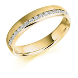 This Ladies 9ct Yellow Gold Half Set Round Brilliant 0.26ct Diamond 4mm Eternity Ring is in a channel set. A channel set Eternity ring has a neat edged style which allows each diamond to sit perfectly side by side. This style is traditional and should be worn next to a engagement ring with either plain shoulders or diamond channel set shoulders of the same style.