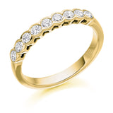 This Ladies 9ct Yellow Gold Half Set Round Brilliant 0.50ct Diamond 3mm Eternity Ring is in a rubover set. A rubover setting describes how each diamond is held. When the diamond is added to the ring it is dropped down into a perfect seat before a small portion of metal is carefully rubbed over the outer edge. This holds it safely in place and creates a clean smooth finish.