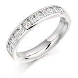 This Ladies 18ct White Gold Half Set Mixed 0.75ct Diamond 4mm Wedding Ring is in a channel set. A channel set wedding ring has a neat edged style which allows each diamond to sit perfectly side by side. This style is traditional and should be worn next to a engagement ring with either plain shoulders or diamond channel set shoulders of the same style.