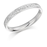 This Ladies 18ct White Gold Half Set Princess 0.50ct Diamond 2.5mm Wedding Ring is in a channel set. A channel set wedding ring has a neat edged style which allows each diamond to sit perfectly side by side. This style is traditional and should be worn next to a engagement ring with either plain shoulders or diamond channel set shoulders of the same style.