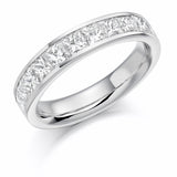 This Ladies 18ct White Gold Half Set Princess 1.50ct Diamond 4.5mm Wedding Ring is in a channel set. A channel set wedding ring has a neat edged style which allows each diamond to sit perfectly side by side. This style is traditional and should be worn next to a engagement ring with either plain shoulders or diamond channel set shoulders of the same style.