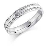 This Ladies 18ct White Gold Half Set Round Brilliant 0.26ct Diamond 4mm Wedding Ring is in a channel set. A channel set wedding ring has a neat edged style which allows each diamond to sit perfectly side by side. This style is traditional and should be worn next to a engagement ring with either plain shoulders or diamond channel set shoulders of the same style.
