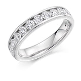 This Ladies 18ct White Gold Half Set Round Brilliant 1.00 ct Diamond 4mm Wedding Ring is in a channel set. A channel set wedding ring has a neat edged style which allows each diamond to sit perfectly side by side. This style is traditional and should be worn next to a engagement ring with either plain shoulders or diamond channel set shoulders of the same style.