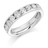 This Ladies 18ct White Gold Half Set Round Brilliant 1.50ct Diamond 5mm Wedding Ring is in a channel set. A channel set wedding ring has a neat edged style which allows each diamond to sit perfectly side by side. This style is traditional and should be worn next to a engagement ring with either plain shoulders or diamond channel set shoulders of the same style.