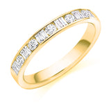 This Ladies 18ct Yellow Gold Half Set Mixed 0.50ct Diamond 3mm Wedding Ring is in a channel set. A channel set wedding ring has a neat edged style which allows each diamond to sit perfectly side by side. This style is traditional and should be worn next to a engagement ring with either plain shoulders or diamond channel set shoulders of the same style.