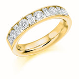 This Ladies 18ct Yellow Gold Half Set Mixed 1.50ct Diamond 4.5mm Wedding Ring is in a channel set. A channel set wedding ring has a neat edged style which allows each diamond to sit perfectly side by side. This style is traditional and should be worn next to a engagement ring with either plain shoulders or diamond channel set shoulders of the same style.