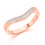 This Ladies 9ct Rose Gold Half Set Princess 0.25ct Diamond 2.5mm Wedding Ring is in a channel set. A channel set wedding ring has a neat edged style which allows each diamond to sit perfectly side by side. This style is traditional and should be worn next to a engagement ring with either plain shoulders or diamond channel set shoulders of the same style.