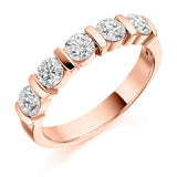 This Ladies 9ct Rose Gold Half Set Round Brilliant 1.00ct Diamond 4mm Wedding Ring is in a rubover set. A rubover setting describes how each diamond is held. When the diamond is added to the ring it is dropped down into a perfect seat before a small portion of metal is carefully rubbed over the outer edge. This holds it safely in place and creates a clean smooth finish.