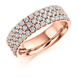 This Ladies 9ct Rose Gold Half Set Round Brilliant 1.05ct Diamond 6mm Wedding Ring is in a claw set. A claw set wedding ring complements almost any engagement ring as the claws which hold each diamond resemble the claws which hold the diamond in an engagement ring. This means that a claw set wedding ring is a great addition in most cases.