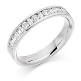This Ladies 9ct White Gold Half Set Mixed 0.50ct Diamond 3.5mm Wedding Ring is in a channel set. A channel set wedding ring has a neat edged style which allows each diamond to sit perfectly side by side. This style is traditional and should be worn next to a engagement ring with either plain shoulders or diamond channel set shoulders of the same style.