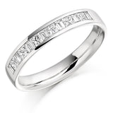 This Ladies 9ct White Gold Half Set Mixed 0.50ct Diamond 3.5mm Wedding Ring is in a channel set. A channel set wedding ring has a neat edged style which allows each diamond to sit perfectly side by side. This style is traditional and should be worn next to a engagement ring with either plain shoulders or diamond channel set shoulders of the same style.