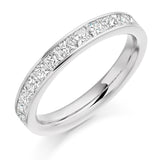 This Ladies 9ct White Gold Half Set Princess 1.00ct Diamond 3mm Wedding Ring is in a channel set. A channel set wedding ring has a neat edged style which allows each diamond to sit perfectly side by side. This style is traditional and should be worn next to a engagement ring with either plain shoulders or diamond channel set shoulders of the same style.