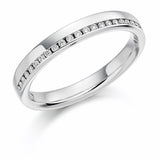 This Ladies 9ct White Gold Half Set Round Brilliant 0.12ct Diamond 3mm Wedding Ring is in a channel set. A channel set wedding ring has a neat edged style which allows each diamond to sit perfectly side by side. This style is traditional and should be worn next to a engagement ring with either plain shoulders or diamond channel set shoulders of the same style.