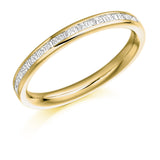 This Ladies 9ct Yellow Gold Half Set Mixed 0.30ct Diamond 2.5mm Wedding Ring is in a channel set. A channel set wedding ring has a neat edged style which allows each diamond to sit perfectly side by side. This style is traditional and should be worn next to a engagement ring with either plain shoulders or diamond channel set shoulders of the same style.