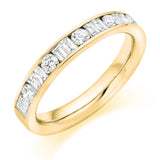 This Ladies 9ct Yellow Gold Half Set Mixed 0.75ct Diamond 3.5mm Wedding Ring is in a channel set. A channel set wedding ring has a neat edged style which allows each diamond to sit perfectly side by side. This style is traditional and should be worn next to a engagement ring with either plain shoulders or diamond channel set shoulders of the same style.